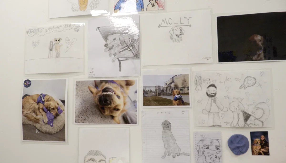 “She has no clue about any of it. To her, this is just another regular day,” Officer Lyke says while looking at the gallery wall of student art in his office with Molly. “She just goes about, but she has really made an impact with a lot of people who just love her.”